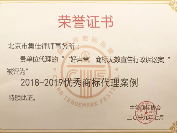 >澳客>关于我们>荣誉概览>2019>集佳代理“好声音”商标无效宣告行政案入选“优秀商标代理案例”