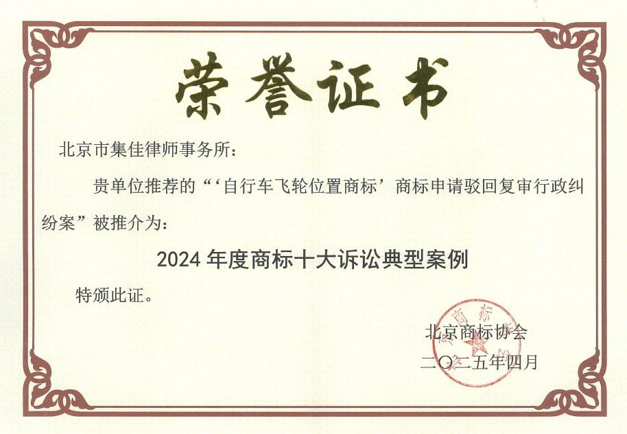 >澳客>关于我们>荣誉概览>2025>集佳代理“自行车飞轮位置商标”行政纠纷案入选北京商标协会年度十大诉讼典型案例